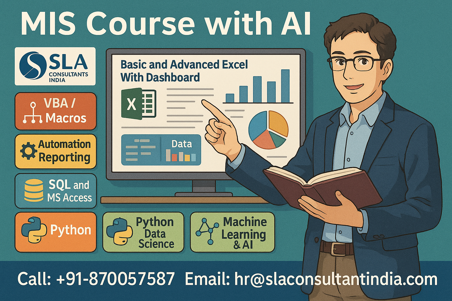 The Excel Automation and MIS Course: Complete MIS Bootcamp, updated with AI skills for 2026 by SLA Consultants Delhi, India, is a comprehensive program designed to train learners in advanced data analysis, automation, and reporting tools essential for corporate roles. The MIS Course in Delhi starts with fundamental and advanced Excel skills including formulas, pivot tables, macros, and data visualization dashboards. It progresses into programming with VBA for automation, database concepts using MS Access and SQL, and BI tool mastery with Power BI and Tableau, integrated with AI-driven predictive analytics and machine learning basics.